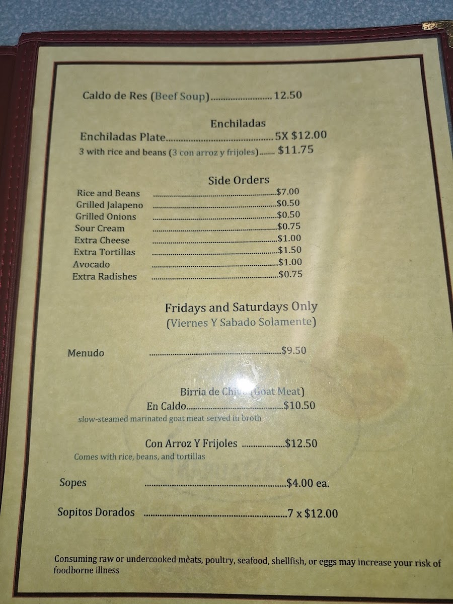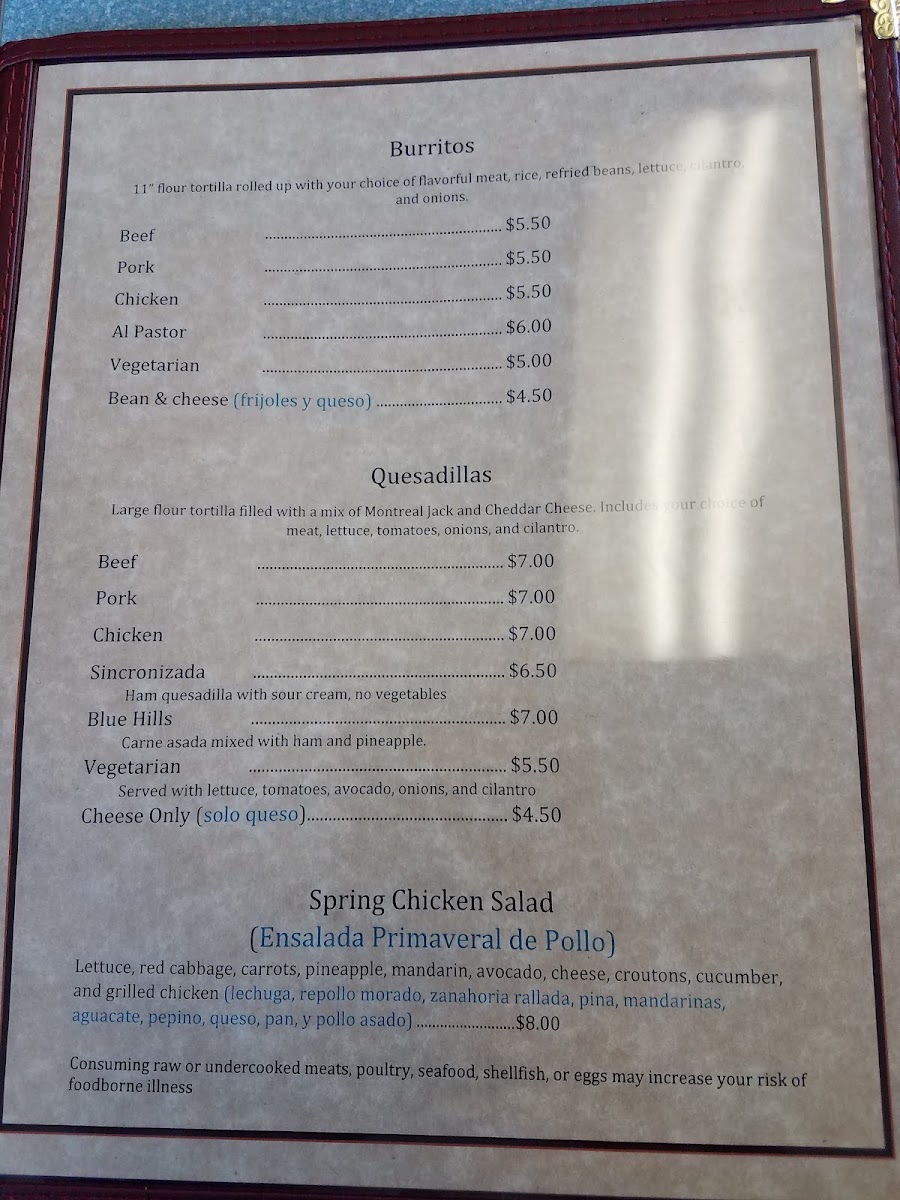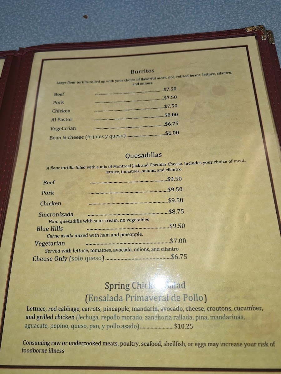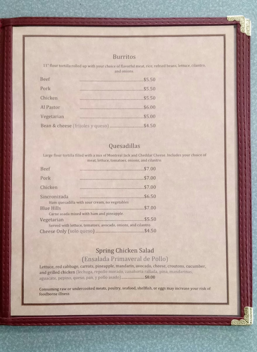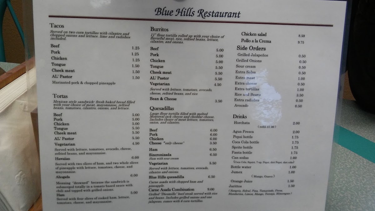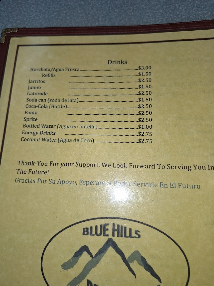 Blue Hills Taqueria offers a menu that feels both authentic and approachable, making it easy for diners to explore a variety of classic Mexican dishes. The taco selection-Asada (beef) Taco, Adovada (pork) Taco, Pollo (chicken) Al Pastor Taco, and Cachete (cheek meat) Taco-is a flavorful starting point, each topped with onions, cilantro, and lettuce. For a heartier bite, the tortas like Asada Torta, Adovada Torta, Pollo Torta, Jamon Torta, and Lengua Torta come on fresh baked bread with beans, mayonnaise, and crisp vegetables. Burrito lovers will appreciate the Asada Burrito, Adovada Burrito, Pollo Burrito, Lengua Burrito, and Vegetarian Burrito, all rolled with rice, beans, lettuce, onions, and cilantro. The quesadillas-Asada Quesadilla, Adobada Quesadilla, Pollo Quesadilla, Jamon Quesadilla, and the Cheese only (solo queso) option-feature a rich blend of Monterrey Jack and cheddar cheeses, complemented by fresh toppings. Fajitas, including Chicken (Pollo), Beef (Res), and Shrimp (Camaron), arrive with rice, beans, and flour tortillas, while specialty dishes like Carne Asada, Camarones Al Mojo De Ajo, Camarones a la Diabla, Camarones Rancheros, and Birria de Chivo con arroz y frijoles highlight the kitchen’s attention to bold flavors. Other options, such as Huarache, Chicken Flautas, and Chicken Enchiladas, along with staples like Rice and Beans, round out the menu. Soups, including Beef Soup (Caldo de Res), Menudo, and Birria Soup (Birria de Chivo en Caldo), offer comforting choices, while the weekend-only items-Sopes and Sopitos Dorados-add a special touch. Refreshments like Horchata, Aguas Frescas, Jarritos, Jumex, and Gatorade complete the dining experience, making Blue Hills Taqueria a destination where every dish, from tacos to specialty plates, delivers both tradition and flavor.